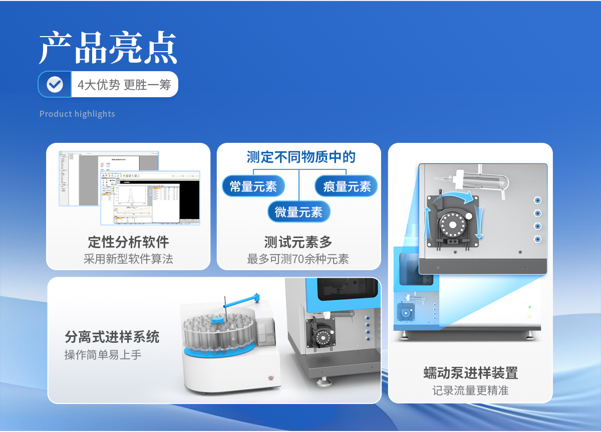 1、測試元素多,*多可測 70 余種元素。 2、多元素同時(shí)測試,一次進(jìn)樣所有元素同時(shí)測試。 3、分析速度快,每分鐘約 5 個(gè)元素,*快測試速度可到每分鐘 10 個(gè)元素。 4、檢出限低,絕大多數(shù)元素可達(dá) ppb 級。 5、線性范圍寬,可達(dá) 5-6 個(gè)數(shù)量級,可以實(shí)現(xiàn)高低含量同時(shí)測試,無需更換標(biāo) 準(zhǔn)曲線。 6、化學(xué)干擾少,測試結(jié)果更加精準(zhǔn)。
